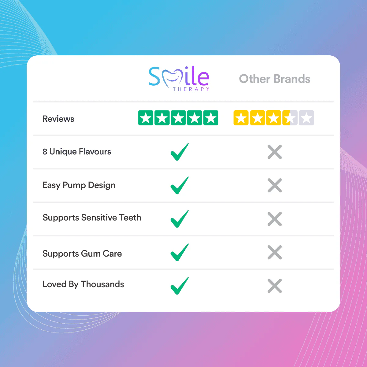 Indulge in the luxurious experience of Smile Therapy's Flavoured Toothpaste. It's not just a quick brush; it's a daily treat for your teeth. Our Fluoride+ formula supports multi-layered care — helping to maintain a brighter-looking smile, soothe the mouth, and elevate your daily oral care ritual.